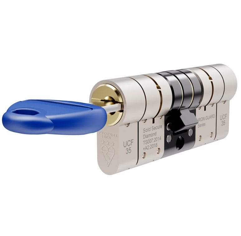 A horizontal keyway for the secure dimple cut key provides visual security to ward off intruders, alongside the Kitemark visible on the face of the cylinder.