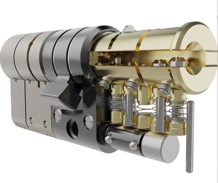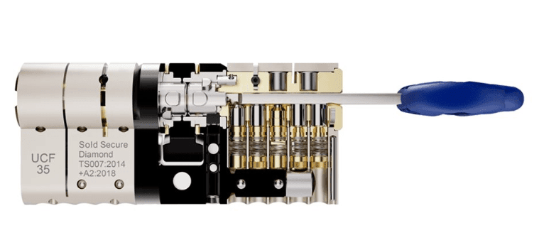 A horizontal keyway for the secure dimple cut key provides visual security to ward off intruders, alongside the Kitemark visible on the face of the cylinder.