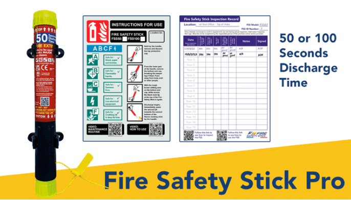Available as the regular Fire Safety Stick extinguisher in 50 or 100 model versions but adapted for non domestic installation. The FFS100-PRO2 pack is supplied with FSS100, x2 mounting clips, tamper tag, install & maintenance stickers and a self adhesive wall sign. There is also a sticker placed on the handle to indicate the installation date and one on the tag to record the regular inspections.