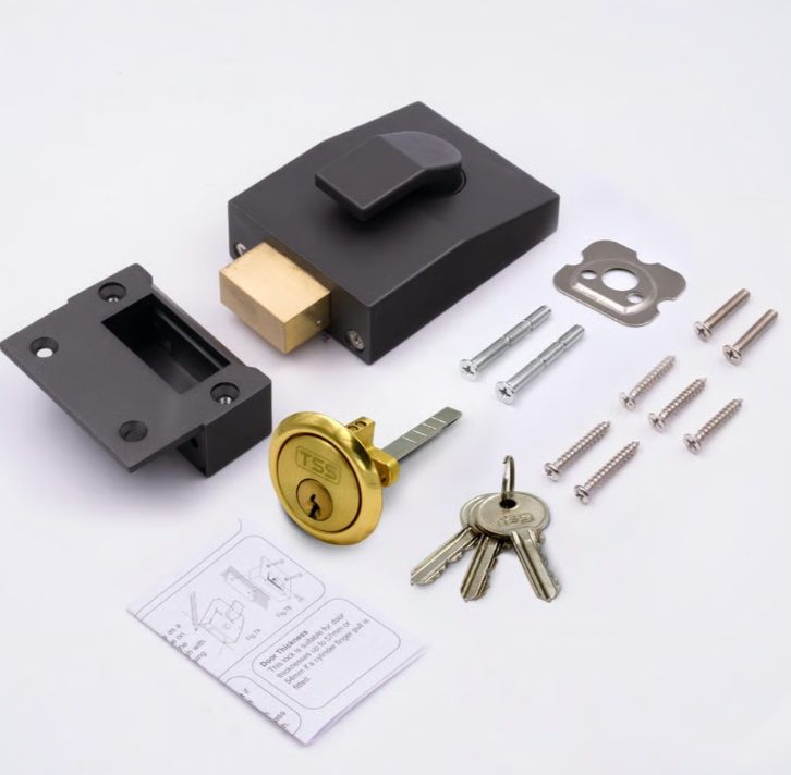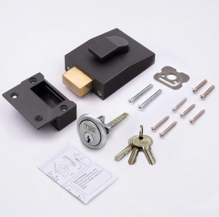 From the outside the key must be used to secure and open the door, from the inside the handle is used. It is important to consider that unlike sprung latch locks with deadbolt nightlatches a positive action must be taken after closing the door to ensure it is secured.